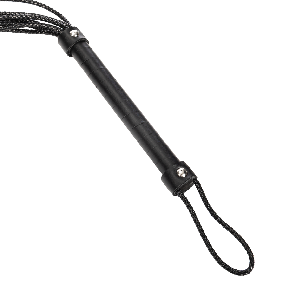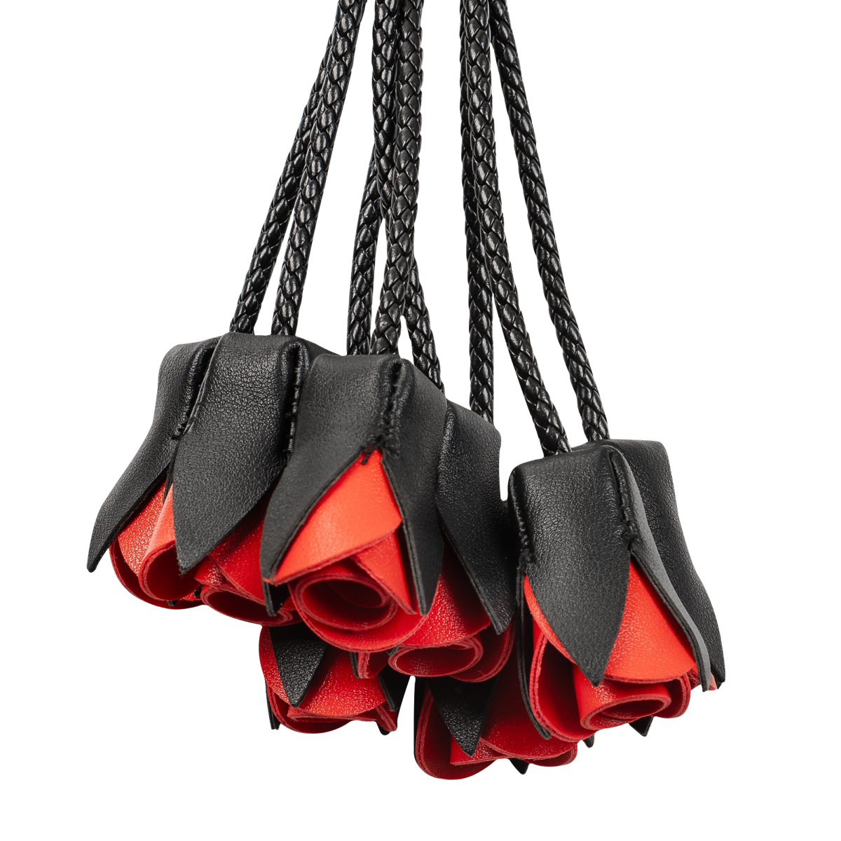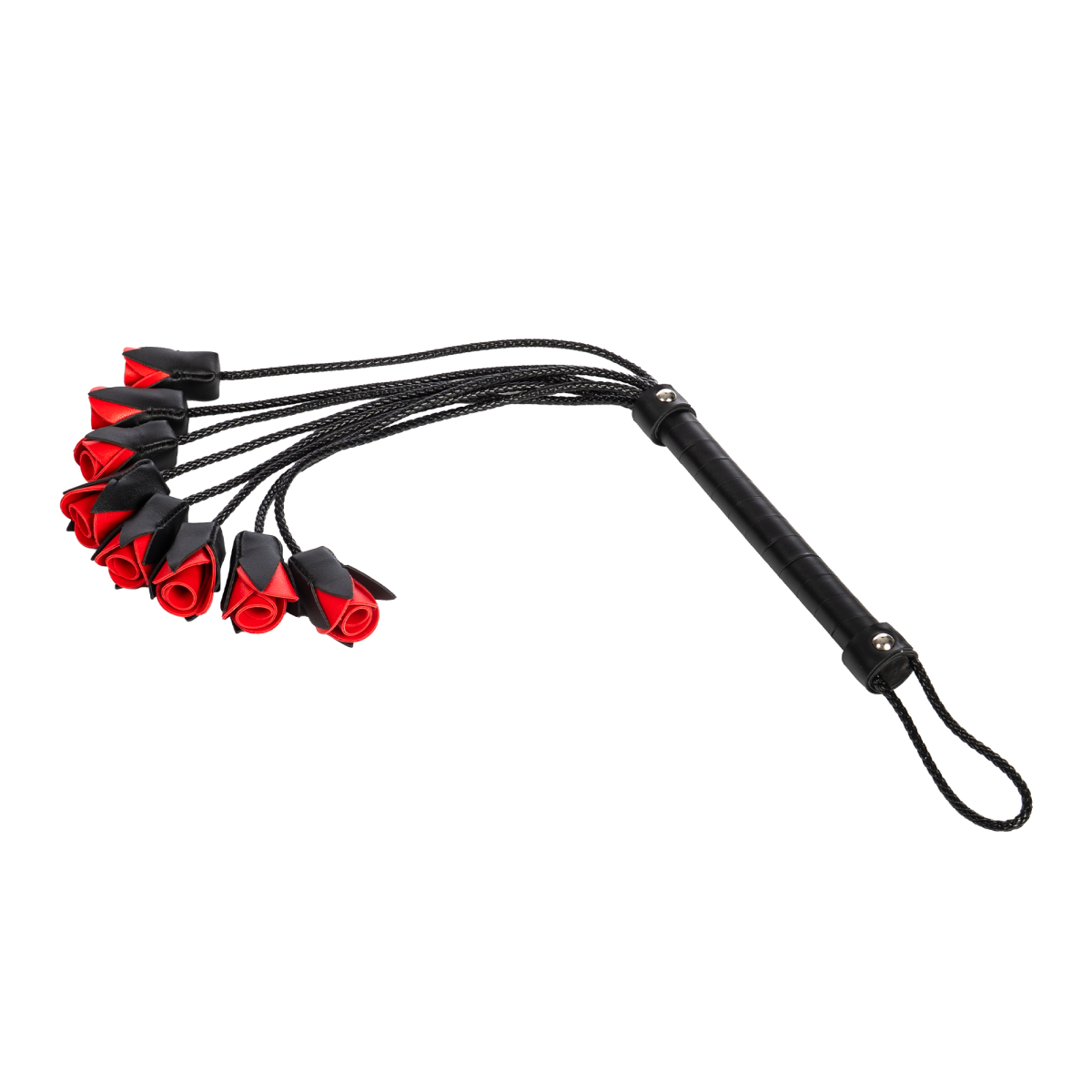 De diepzwarte basis en vurige rode rozen maken deze zweep een echte blikvanger in elke speelse setting.