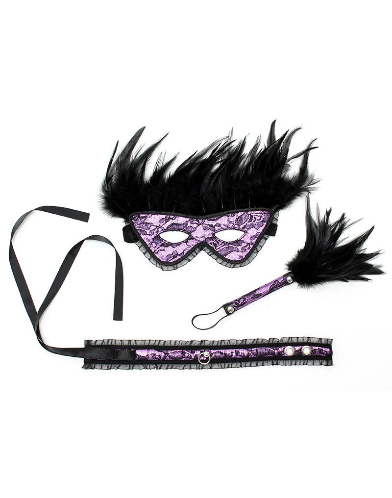 Luxe dominiset bestaande uit masker en kietelaar met veren en halsband.