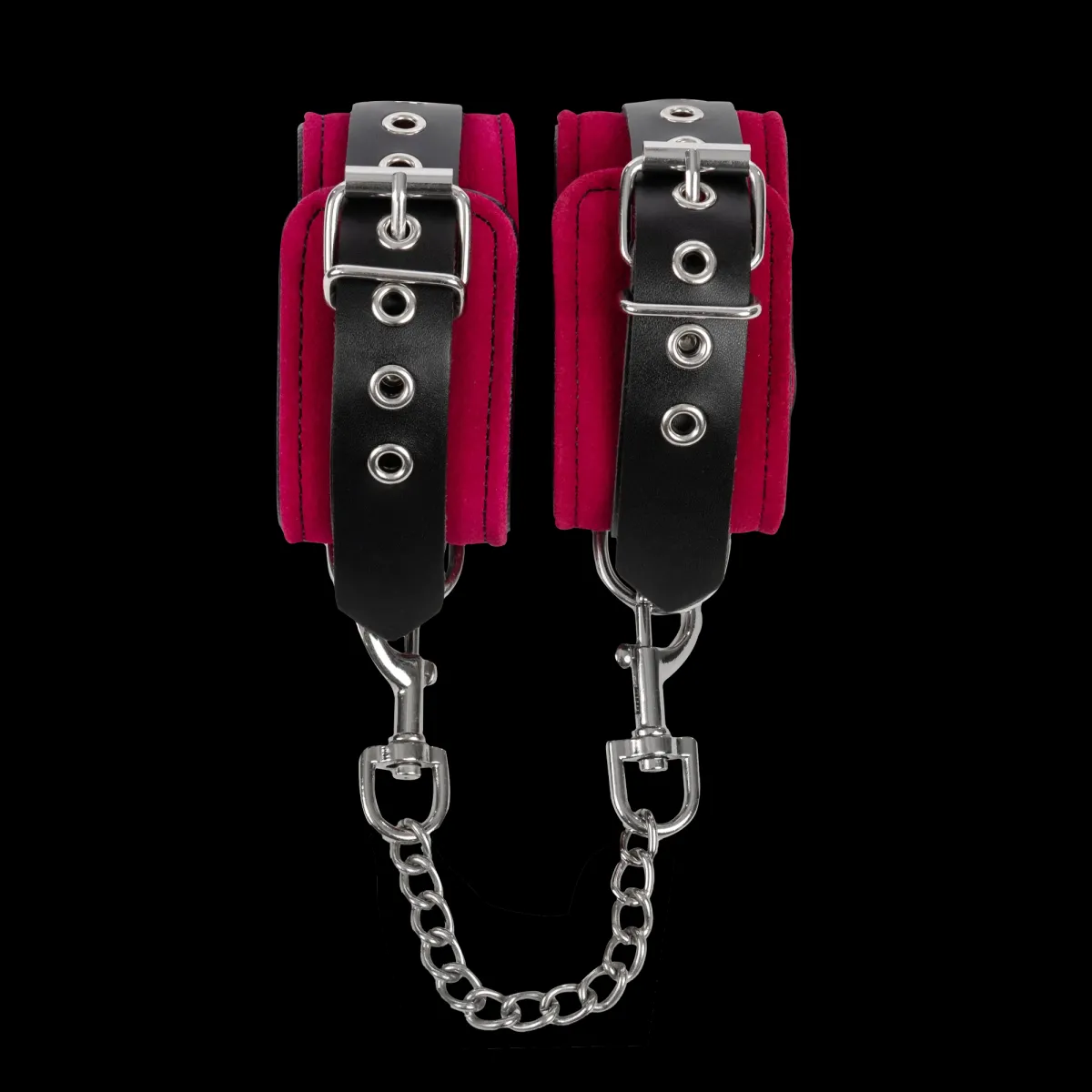 Luxe, echt lederen handboeien in het zwart met aan de binnenzijde glad leer en roze suede leer aan de buitenkant. De boeien zijn 5,5 cm breed en zijn verstelbaar met gespen en banden met 6 gaatjes. De boeien zijn verbonden met een metalen ketting met karabijn haken aan beide uiteinden. De bijhorende handboeien hebben artikelnummer # 7964