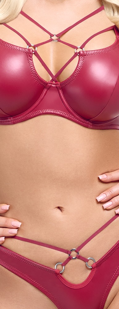 Beugelbeha en string van Cottelli LINGERIE. Beide in een verfijnde rode wetlook – zacht en elastisch voor maximaal comfort. Beugelbeha met elastische bandjes en decoratieve zilverkleurige ringen in het decolleté. Met een verstelbare haaksluiting op de rug. De bandjes zijn ook verstelbaar voor een perfecte pasvorm. Rio string met decoratieve zilverkleurige ringen en elastische bandjes aan de voorkant van de tailleband. Hoge beenuitsnijdingen laten de billen en benen perfect uitkomen.