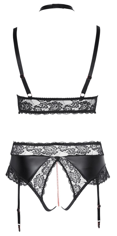 Zachte bh en jarretelslip ouvert van Cottelli CURVES in een mix van matte look met zacht elastisch kant en roségoudkleurige elementen. De beha scoort met haar decolletékettingen, die afneembaar zijn van de nekband (met klittenbandsluiting) en de beha. De slip is uitnodigend open bij het kruis tot boven de billen en heeft een stimulerende kruisband. De verstelbare bretels zijn afneembaar van de slip.