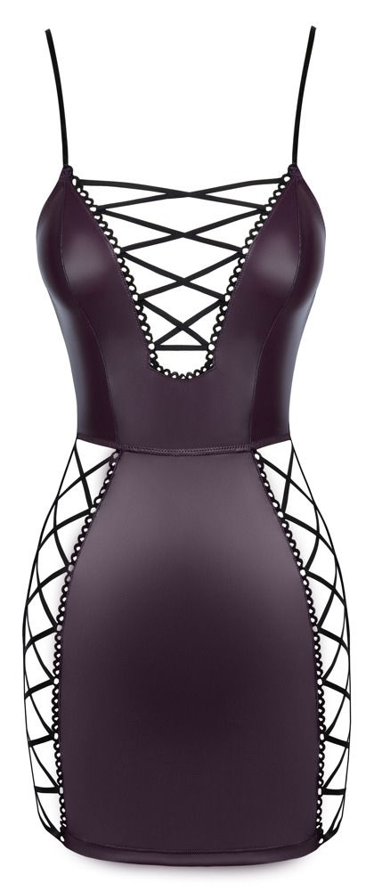 Babydoll en kruisloze slip van Cottelli CURVES. Gemaakt van elegant donkerrood kant – overal zacht en elastisch voor een hoog draagcomfort. Verleidelijk opgevoerd met elastische fluwelen linten en roségoudkleurige accessoires. Nauwsluitende top met een hartjeshanger tussen de zachte cups. Verstelbare haakjessluiting op de rug. De bandjes kunnen ook worden aangepast. De uitlopende korte rok heeft een sexy split aan de achterkant. De bijpassende kanten slip verleidt met zijn open kruis.