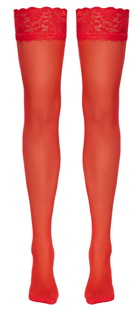 Rode, zijdeachtige kousen van Cottelli LEGWARE met een elastische, 9 cm brede kanten bovenkant. Garen dikte 20 deniers. Oeko-Tex gecertificeerd.
